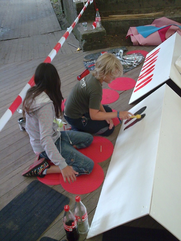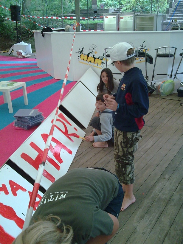 The Lounge consisted of two area's; one area were shoes were allowed, and the area with the carpet, where they weren't. A group of children helped with the decoration of the 'wall' in between those two area's.